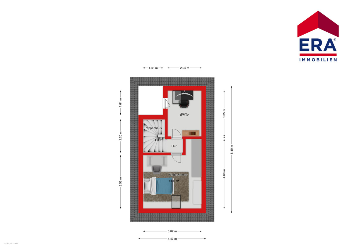 Das umgebaute Dach bietet zusätzlichen Raum, der als Büro. Gegenüber steht noch ein Raum, der als Hobby- oder Spielzimmer genutzt werden kann.
