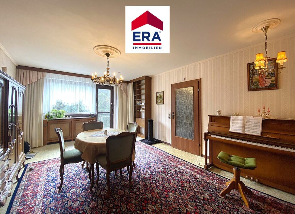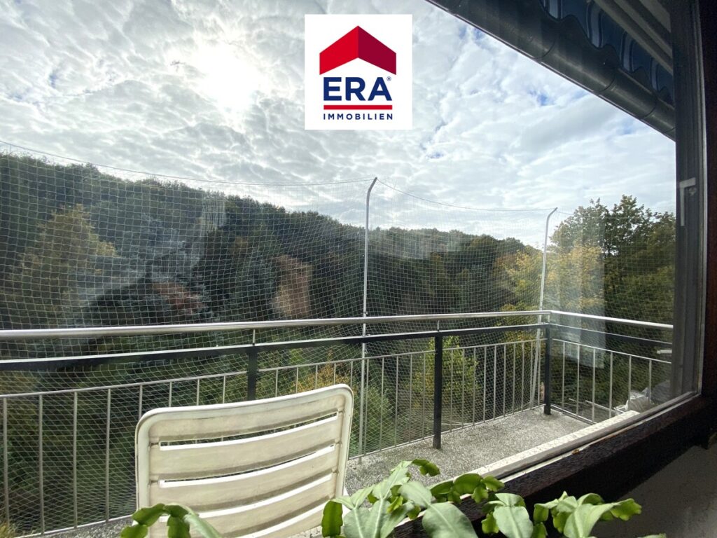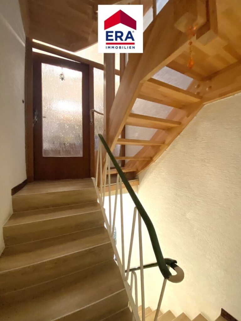 Über das Treppenhaus erreichen Sie das erste Obergeschoss, hier befinden sich das Wohnzimmer, die Küche, ein Badezimmer mit Wanne, Waschbecken und WC, das helle Esszimmer welches über einen Zugang zum Balkon mit Blick ins Grüne profitiert, sowie das Schlafzimmer.