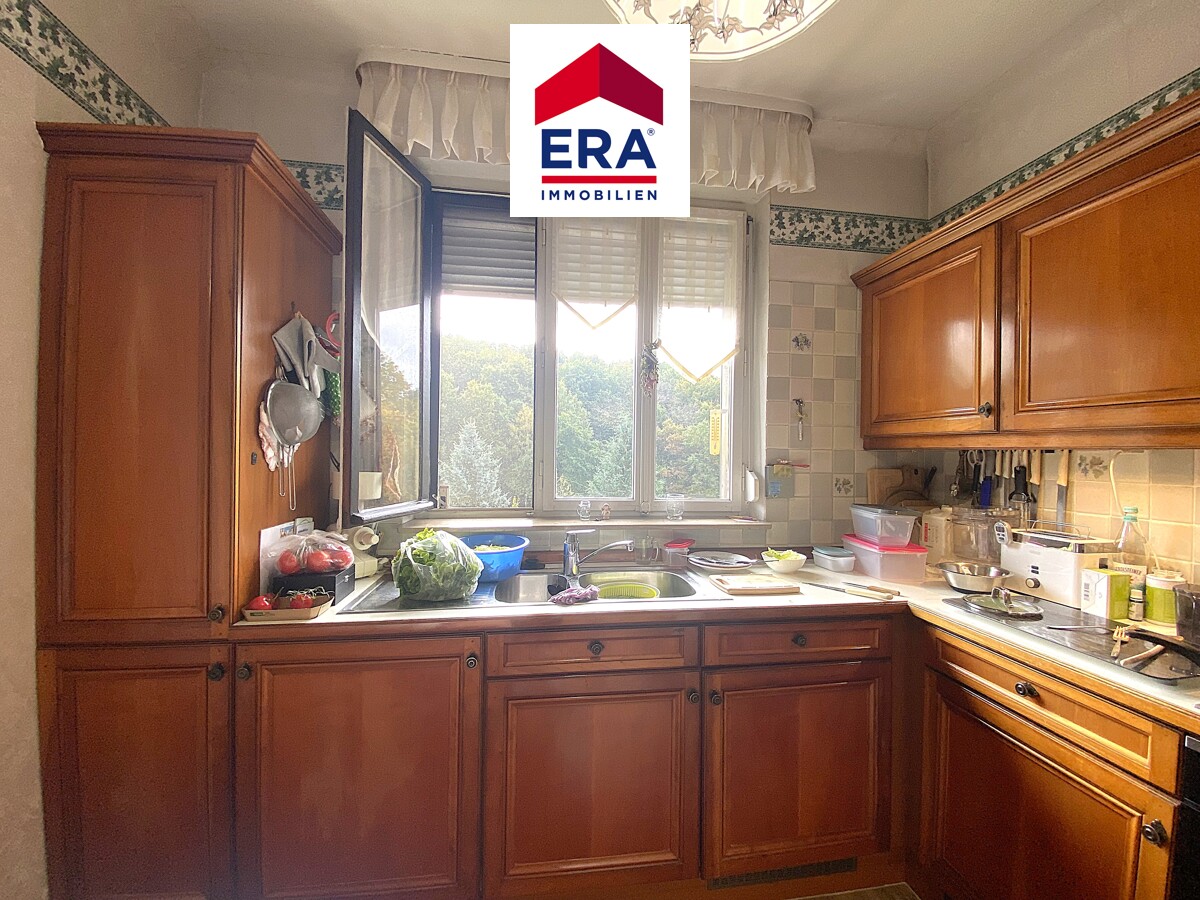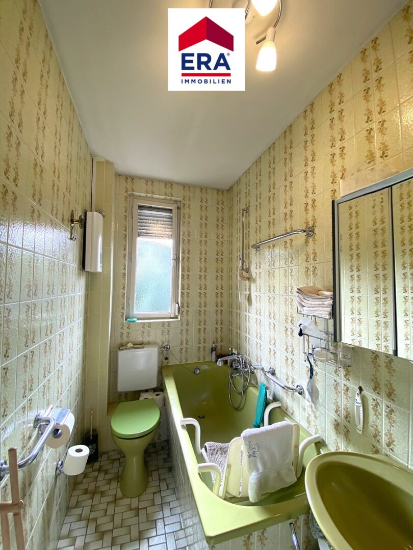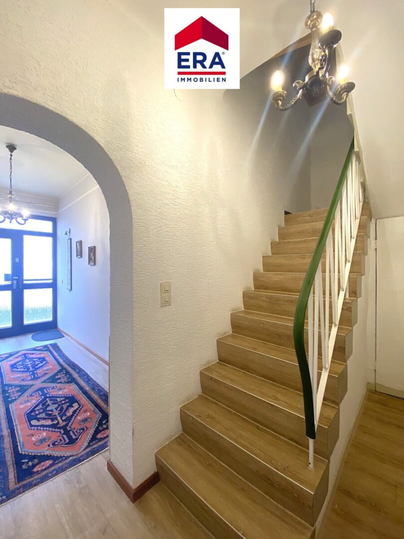 Über das Treppenhaus erreichen Sie das erste Obergeschoss, hier befinden sich das Wohnzimmer, die Küche, ein Badezimmer mit Wanne, Waschbecken und WC, das helle Esszimmer welches über einen Zugang zum Balkon mit Blick ins Grüne profitiert, sowie das Schlafzimmer.